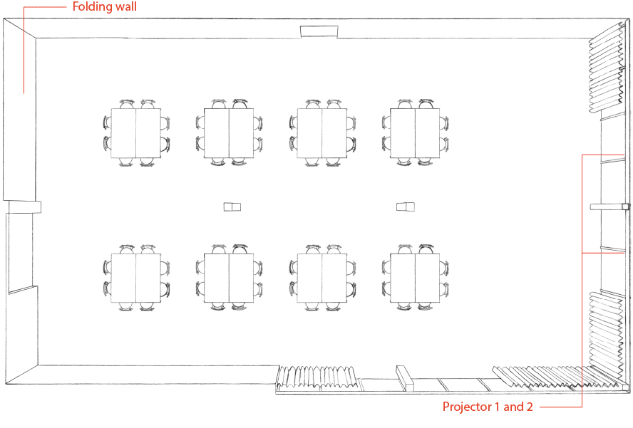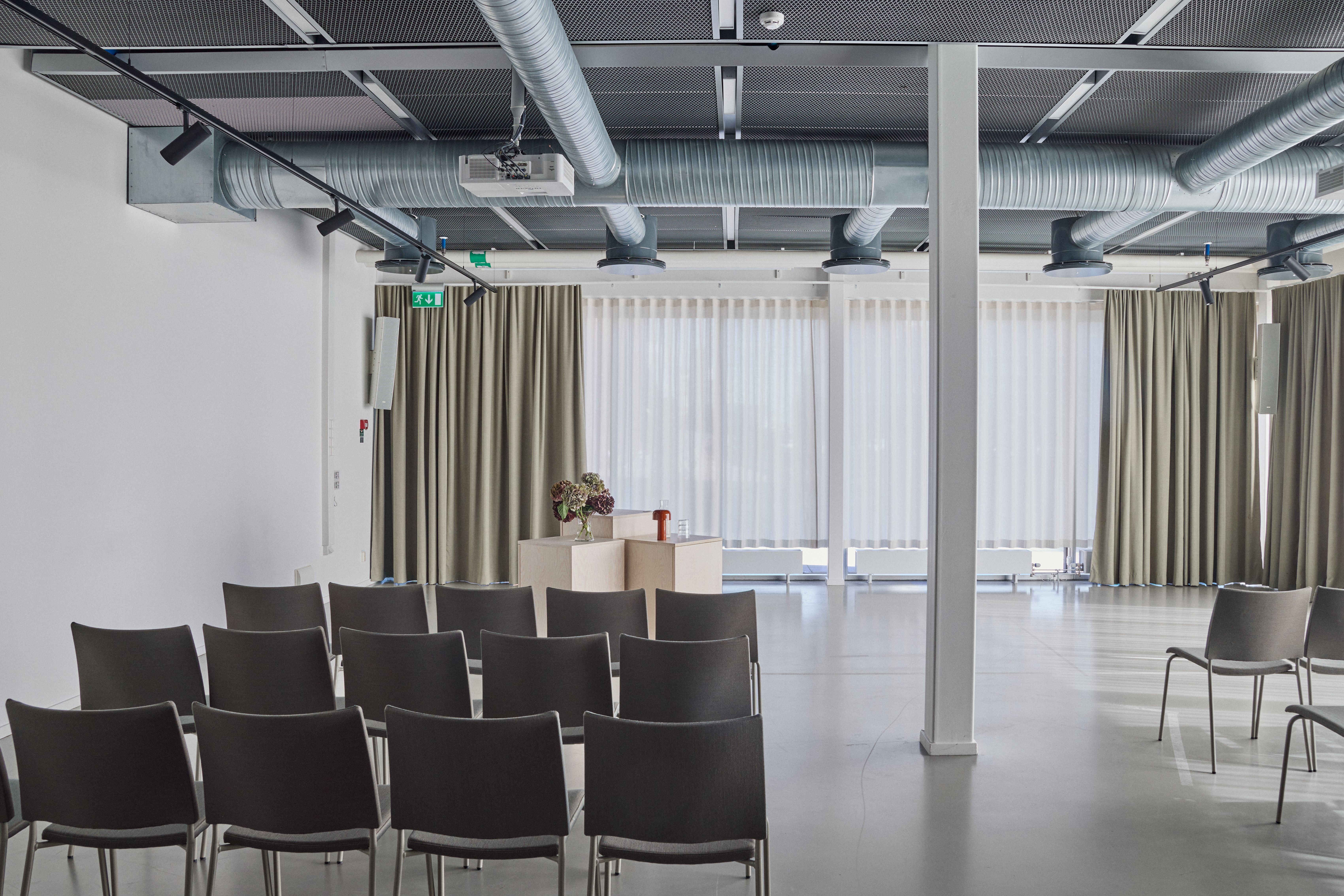 A large flexible space with floor to ceiling windows facing the harbour and the old dry dock. Perfect for seminars, long workshops, kick-offs, launches, conferences, exhibitions, mingle, evening events and so on. Featuring two projectors, 4 head-mics, 2 handheld mics, sound system, moveable tables, comfortable chairs and rolling whiteboards. An openable wall allows the space to expand into the open area, creating a seamless connection to the bustling atmosphere outside.