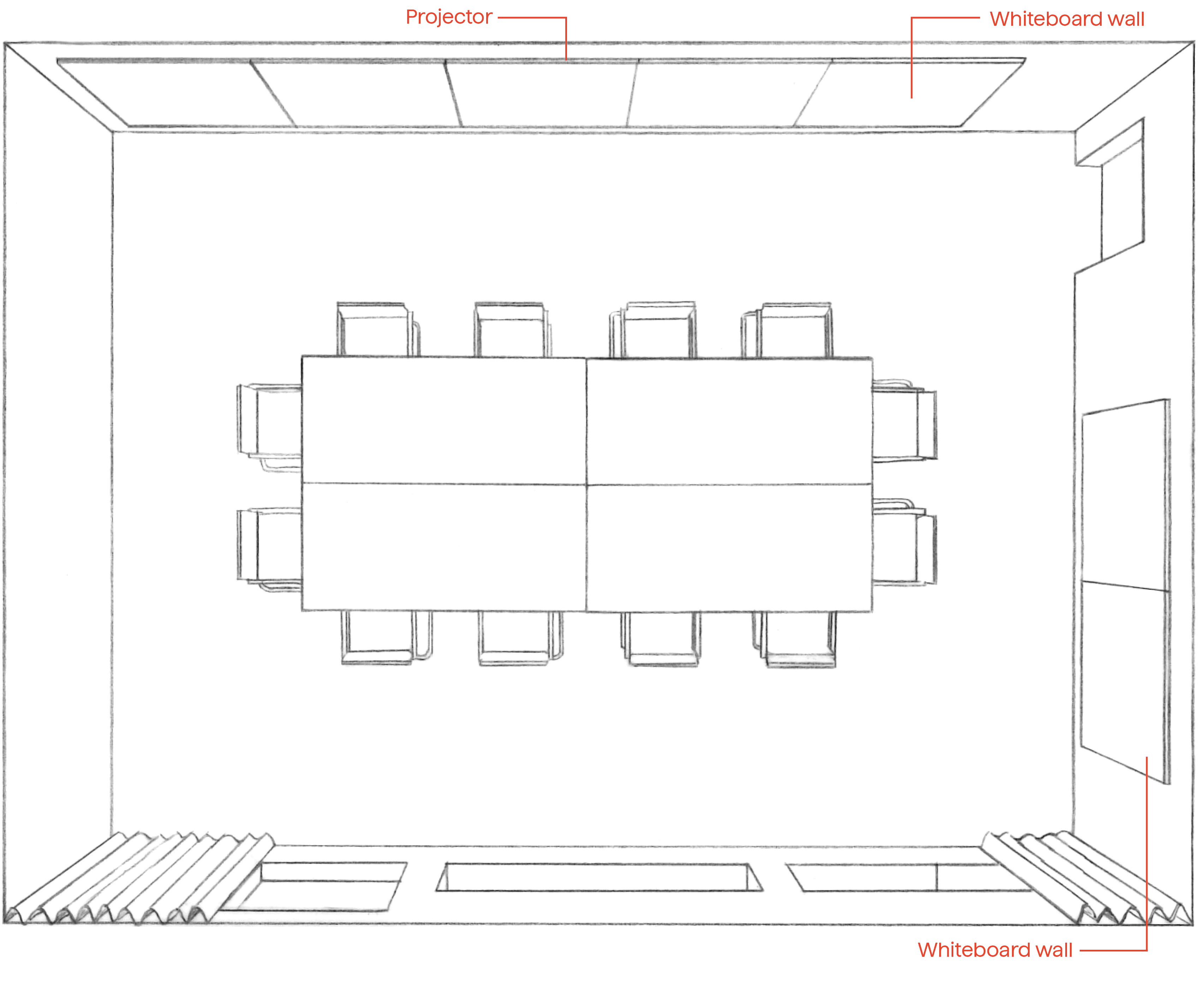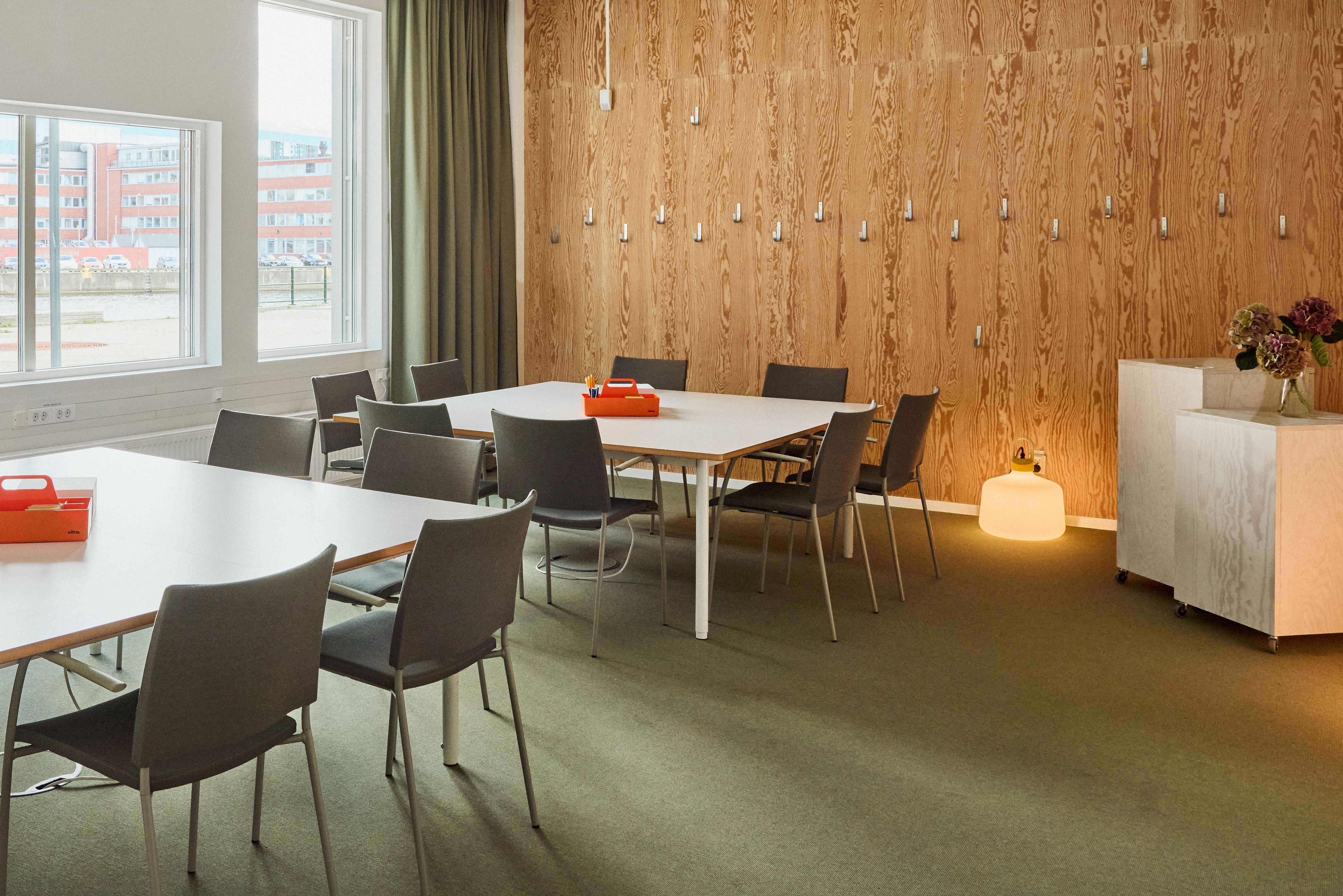Light, spacious meeting room for team meetings and workshops. A beautiful view to the east of the harbour. Featuring two large tables, 16 chairs, a projector, and whiteboard walls.