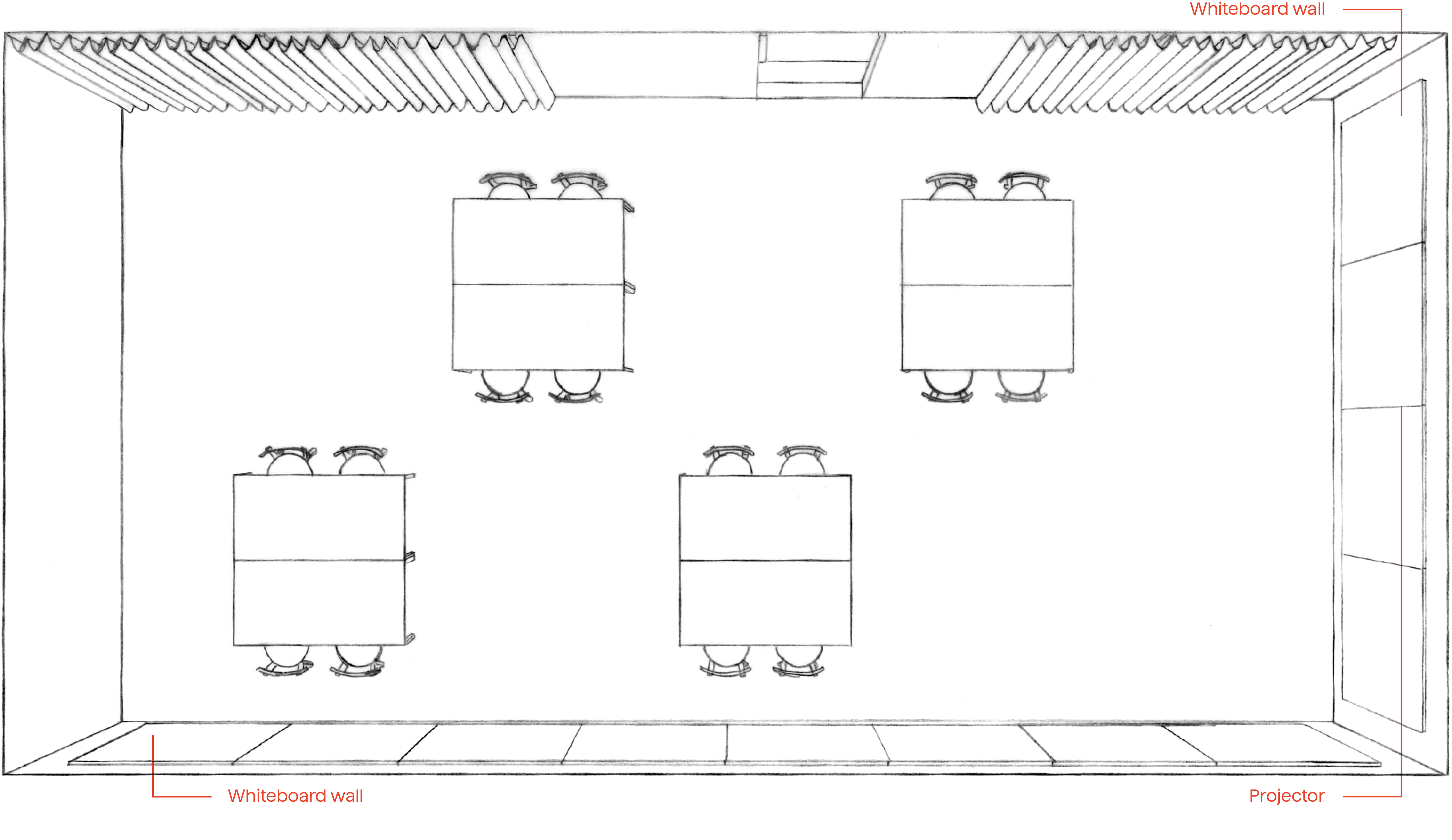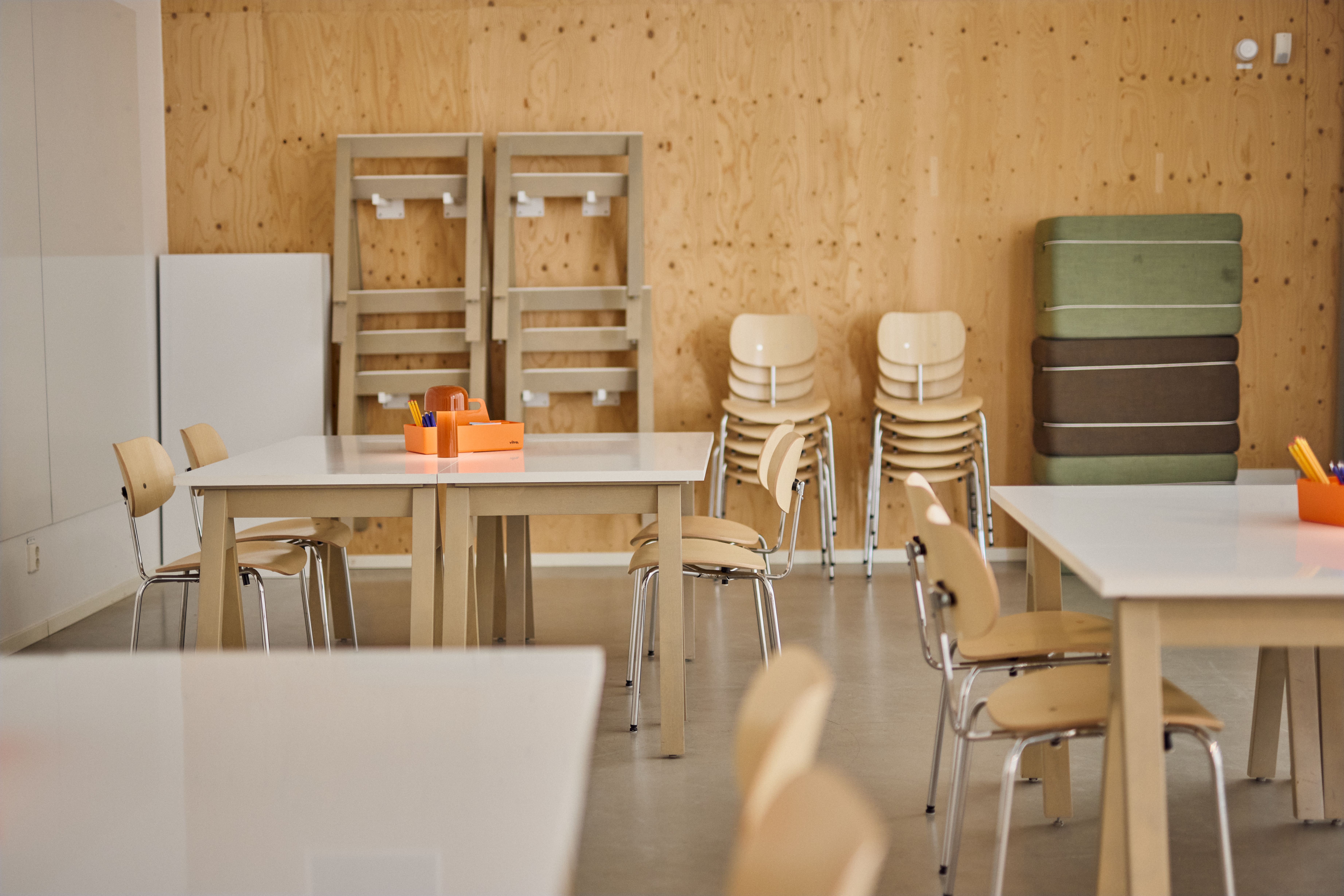 A playful workshop room where you are allowed to draw on both walls and tables. It is easily customizable to fit every part of the creative process. Featuring 24 Eiermann chairs, 12 tables and 6 pouffés to sit on, 14 meter whiteboard walls, projector and loudspeakers.